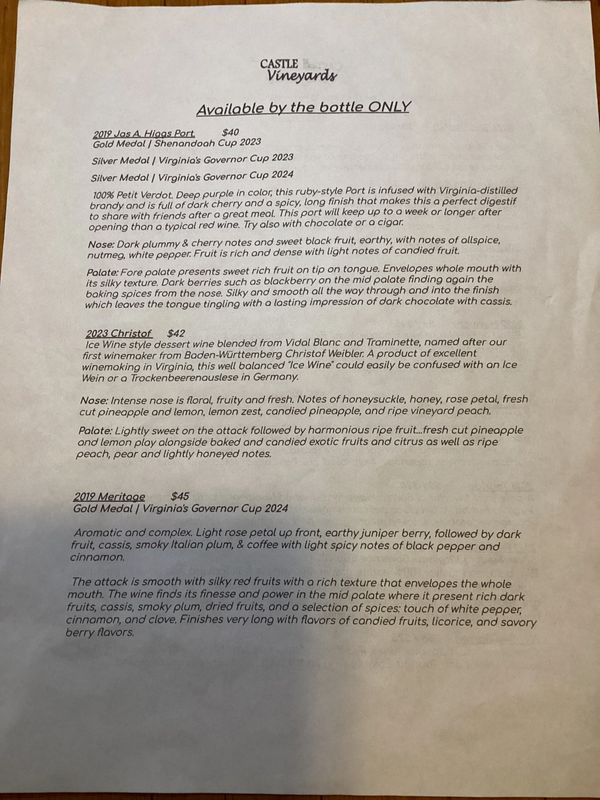 We are a wine tasting room and vineyard located north of Luray Va in Page County Va. We exclusively offer wines aged and bottled by Barren Ridge Vineyards. This joint venture of R. Steven Davis (Uncle) and Jeremy A. McCoy (nephew) opened in August of 2017. Castle Vineyards in Luray gets it's name from our Father/Grandfather Ralph Castle Davis, a local businessman and farmer. Our vineyard is growing on our working cattle farm, where we have a cow/calf operation of approximately 35 head of Angus cattle.